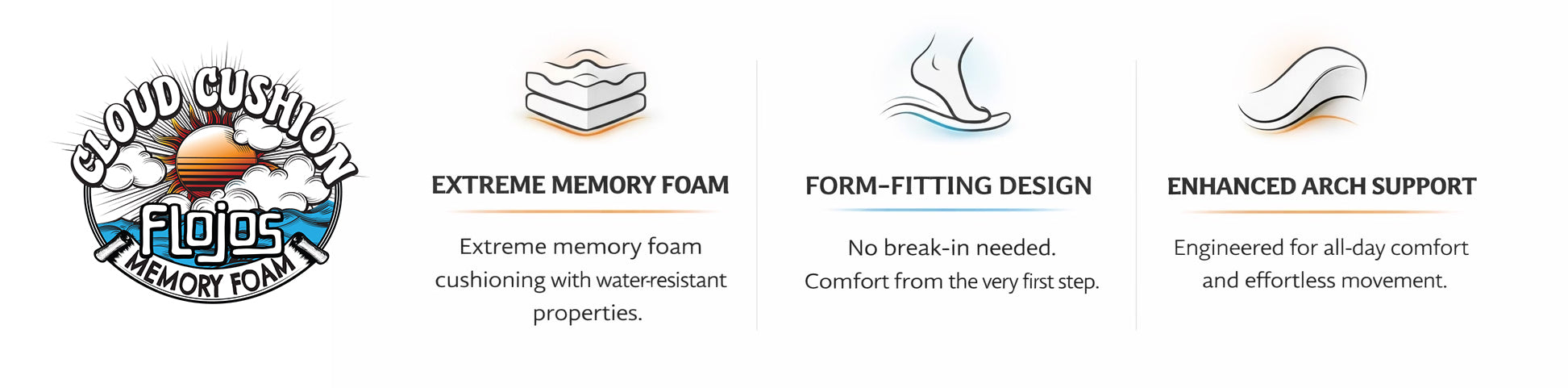 A next-level memory foam with water-resistant durability. Enhanced arch support. Zero break-in required. Instant comfort. Welcome to Cloud Cushion.